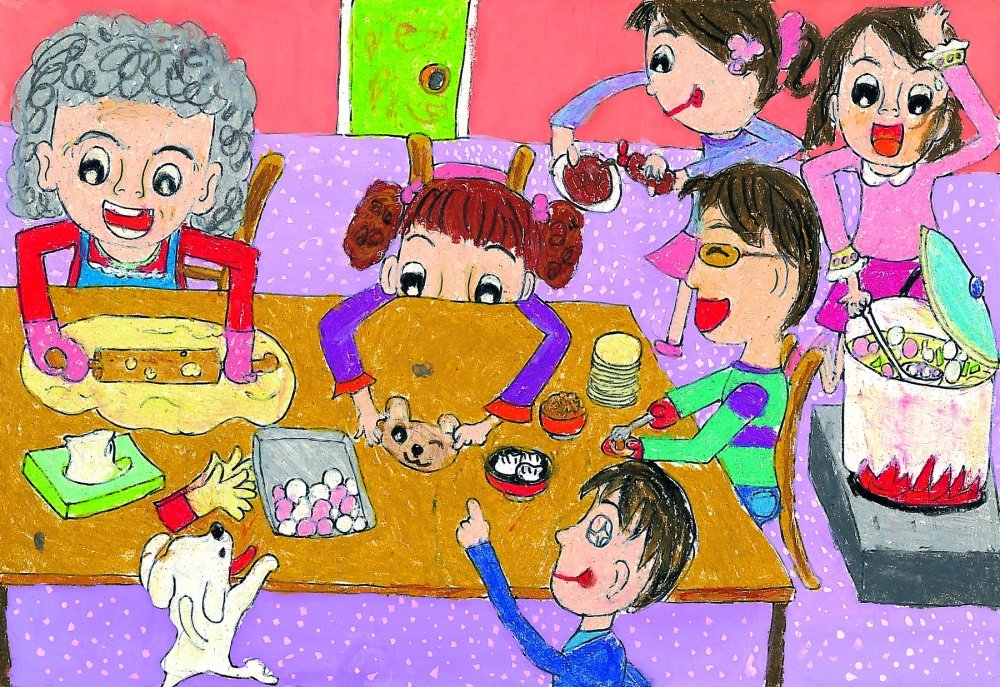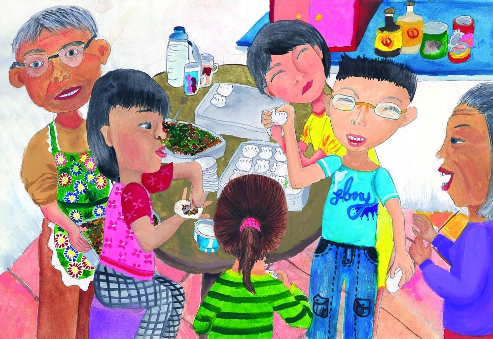 全家人歡聚在一堂,談天說地,一波波幸福的漣漪,在每個人的心湖裡盪漾。在這小小的餐廳裡充滿著歡騰的氣氛,每個人的嘴角旁都掛著甜美的笑靨,愉悅的笑聲衝出門外,就連夜空上的星星,也不時投來羨慕的眼光。