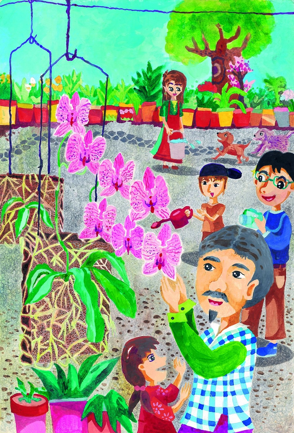我家陽台成為我們家有事沒事喜歡擠在那裡的地方,有時看書、有時種植花草,爸、媽常說:「我們家沒錢,但書最多。」因此看書是全家共同的興趣,機械天才-爸爸,常和我們談論文學,令人刮目相看,心理學及生命教育繪本是媽媽的最愛,她常和我們分享認輔學生的心得。至於我們三姐妹喜歡看漫畫、小說、名人傳奇,我們時而種花、時而閱讀,在不同的季節我們可以享受花香,欣賞五彩繽紛的花朵,陪伴我們成長,度過每一個快樂的時刻。