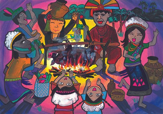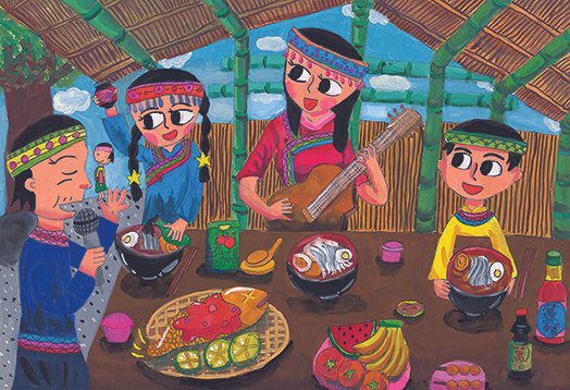 用餐時刻,阿公一聲「吃飯囉!」全家就從屋子各個不同的角落集合到這桌前,桌上擺滿了令人垂涎的食物,熱氣騰騰,似乎象徵家人相聚的溫馨!
