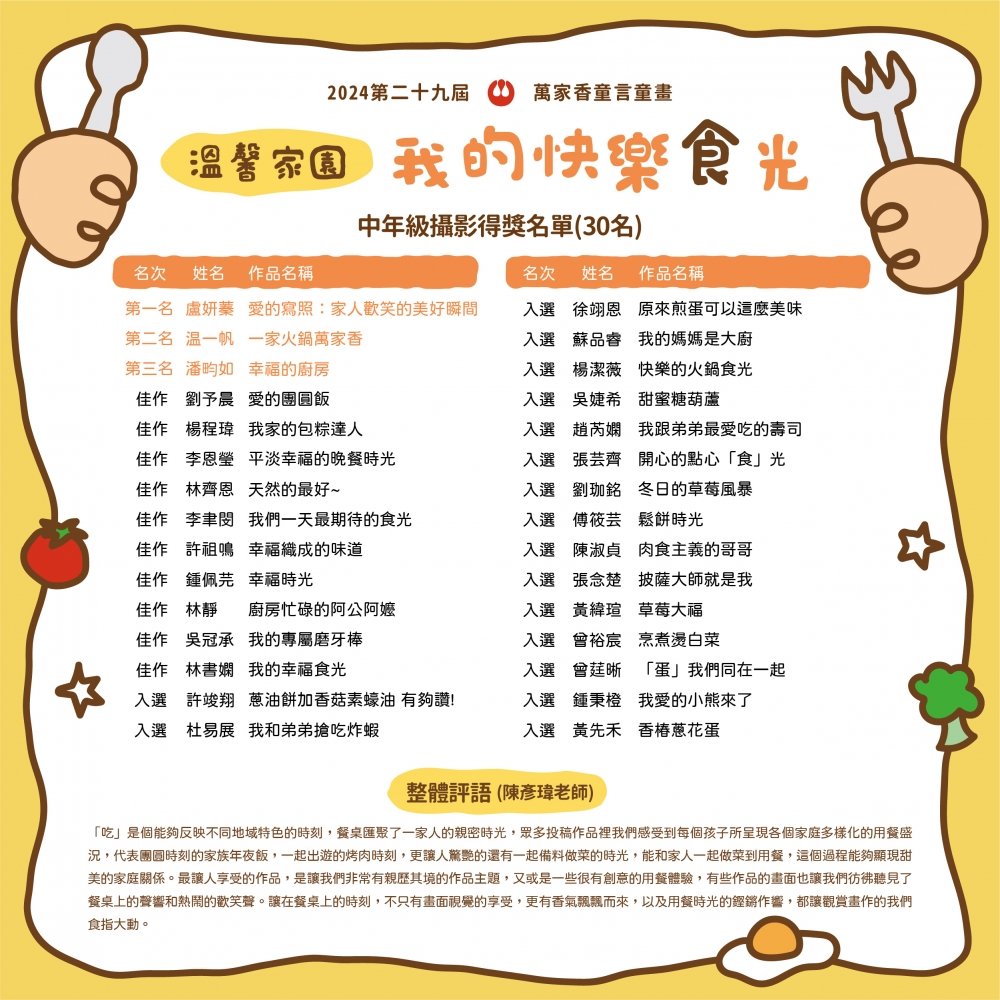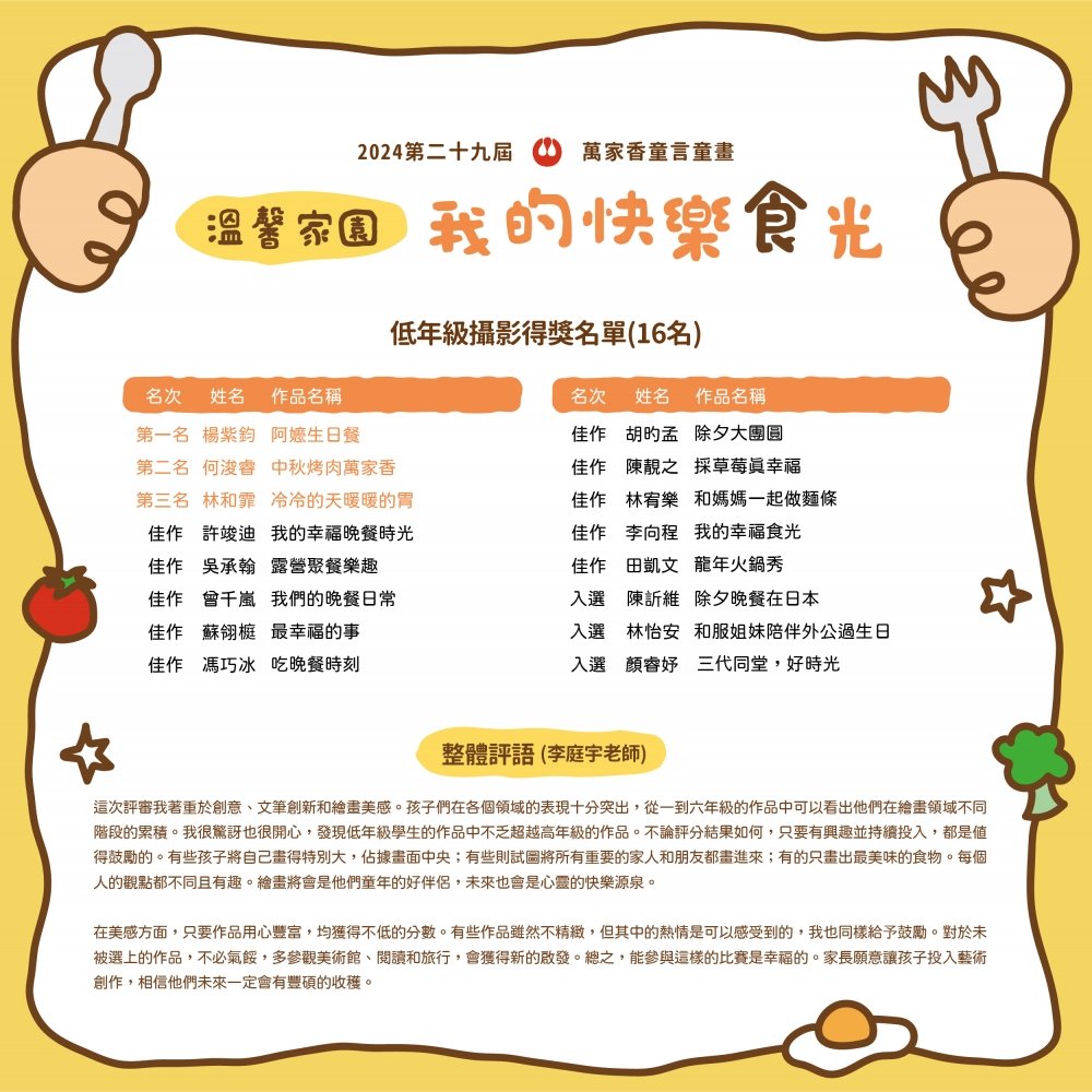 補充說明:低年級攝影組因件數不足,入選獎項部分從缺