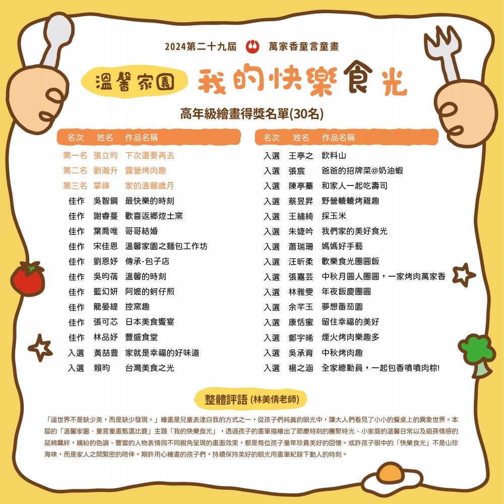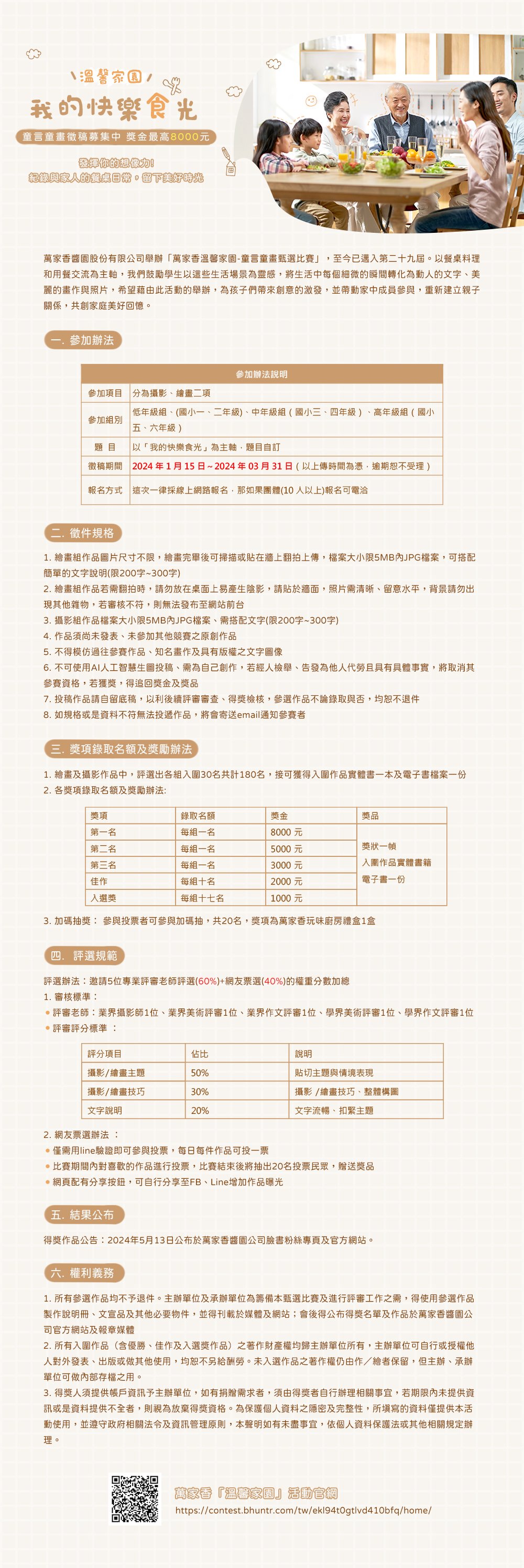 每個家庭都有個動人故事,也有屬於自己的獨特味道,可能甜蜜、可能辛辣,也或許平淡卻幸福而恆久。萬家香「溫馨家園」童言童畫甄選比賽,將邁入第29年,透過繪畫及寫作,帶出動人的家庭故事,回想當年參與的小朋友,如今已為人父母,正與孩子們一同編織更加深刻濃厚的故事。現在,讓孩子們繼續將屬於自己家庭的故事,寫畫成動人的文章或圖畫,和萬家香醬園股份有限公司一起延續這份溫馨家園的幸福滋味吧!