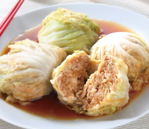 將絞肉丸子包入川燙過的大白菜後,平放在鍋中並加入調味料B,沸騰後轉小火慢煮至熟透即可。