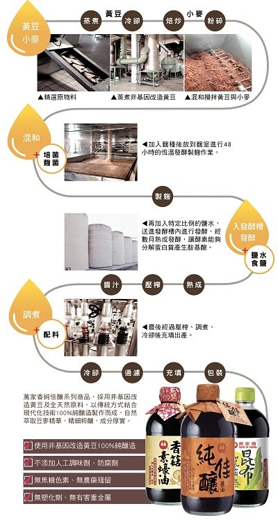 醬油是每戶家庭廚房中必備的調味品,但近年來台灣層出不窮的食安問題,消費者對於醬油的選擇變得更謹慎。萬家香以屏東廠為生產中心,推動全廠「純釀造化」生產,為台灣第一家全廠100%純釀造的大型釀造業者。在2014年萬家香做出重大決策,全面使用非基因改造原料,推出的「純佳釀醬油」受到消費者青睞,而在2015年更積極完成全廠非基改化,盼成為台灣第一家全廠非基改化的大型釀造廠。從全面純釀造化到全面非基改化,萬家香就是要給消費者更放心的好選擇!