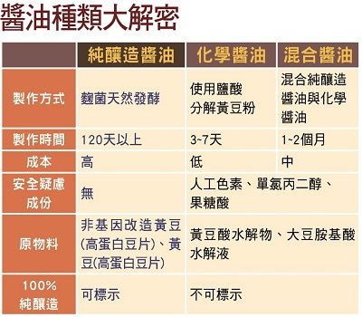 一般醬油的製作方法分成釀造法(純釀醬油)、速釀法(化學醬油)以及混合法三種,而真正純釀醬油即是採用釀造法製成,使用黃豆與小麥經蒸煮或炒,再製麴後加入鹽水入槽,經過半年發酵才能釀造出美味又健康的醬油。便宜、速成的化學醬油,大多由黃豆粉加入鹽酸水解製作而成,只要約一個禮拜的時間就可以完成製作,不僅含有過多對身體有害的成分,以人工色素調整顏色,甚至含有致癌物「單氯丙二醇」對身體產生極大威脅。而混合法製成的醬油則是以上述二種方法,以不同比例混合調製的產品,其香味不如純釀造醬油,且依舊含有化學成分,吃多了對健康也不好。
