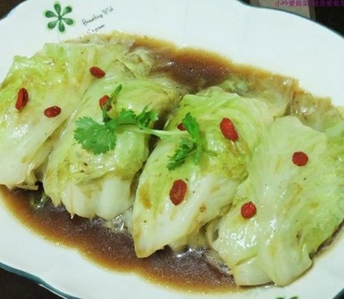 高麗菜封湯汁入味軟化即完成,可隨個人喜好以少許香菜裝飾。
