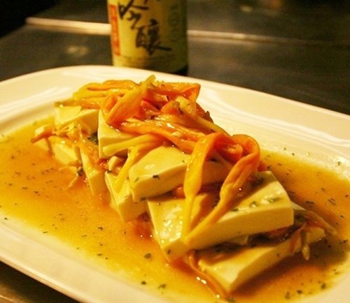 高湯煮至沸騰,加入大吟釀薄鹽醬油、米酒、糖,一同加熱攪拌。將豆腐鋪在盤上,放上金針花,再擺上一層豆腐,最後在疊上一層金針花。
