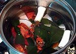 將蔬菜洗淨、切段備好。準備一鍋水,放入蔬菜、八角和花椒,開火煮滾後,倒入醬油、黑糖。