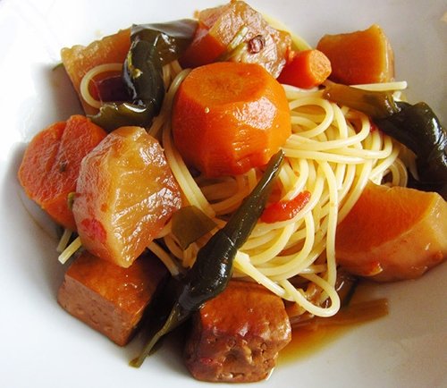 義大利麵煮熟後加入滷好的蔬菜即完成。